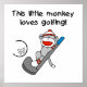 A cute golfing design featuring a sock monkey golfer with a club and golf ball and text that reads "This little monkey loves golfing!".