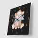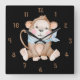 This wall clock displays the body of Monkey Mike a baby monkey in the centre wearing a blue bandanna with pink cheeks in a sitting pose inside of brown numbers with black background in this animal theme & style. This clock is made for any wall and printed with a AcryliPrint®HD process measures 10.75"x10.75" and made from grade-A acrylic. Battery operated uses one AA battery for Indoor use only, not recommended for outdoor use.