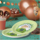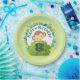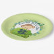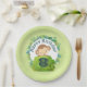 A set of paper plates with a cartoon illustration of a little monkey peeking out from behind a green bush. Surrounded by a wreath of tropical leaves. Set on an olive green watercolor background. The customisable text says Happy Birthday and the guest of honour's age.