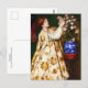 A postcard with the fine art painting, Monna Rosa (1867) by Dante Gabriel Rossetti (1828-1882). A portrait of a woman in a gold embroidered dress cutting a pink rose from a bouquet. Rossetti was a poet and illustrator born in England, son of an Italian poet. His art is chraacterised by its sensuality. He also founded the Pre-Raphaelite Brotherhood.