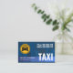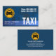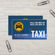 An artistic design of a blue shaded downtown building silhouette. Over at the top is a large yellow taxi logo you can use with the contact details to the right. Near the base is your prestigious name and job title with the oversize business name "TAXI" to the right.