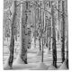 This black and white photograph shows white bark Quaking Aspen tree trunks with long shadows in a winter snow.