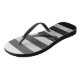 A pair of flip flops with a cool monochrome shades of grey colour block stripes pattern design and a customisable white name print.