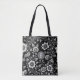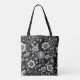 Wild roses in shades of gray, from silvery to charcoal, on a black background with a decorated arch, makes a beautiful Goth tote bag.