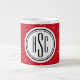 Impressive big monogram on this jumbo 20oz coffee mug, featuring circle double-framed initials on a red and white mini stars pattern. Easily change the initials using the Template provided. Height: 4.5", diameter is 3.9". Microwave and dishwasher safe. See "About This Product" at side for more information.