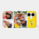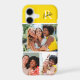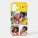 This iPhone case features space for 3 photos and is accented with a modern monogram at the top. The background color is bright yellow.