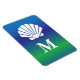 Monogram cruise magnet cabin door decoration with a sea shell on blue green ombre blend background. Edit the custom text initial letter to mark your stateroom door and recognise it easily with your personalised sign. Simple and elegant but fun design.