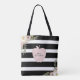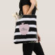 A tote featuring a light pink apple. Personalise the name on apple. Background is black and white stripes with floral designs at top left and bottom right.