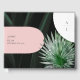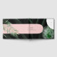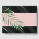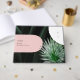 Blush pink and white arches over dark palm leaf background with monogram, name and date, and watercolor palm leaf illustrations.