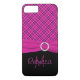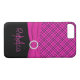 Monogrammed modern black and hot pink blue plaid checked pattern iPhone 7 case with a PRINTED fuchsia pink ribbon and diamond jewel brooch on it that can be customised with your logo, name, initials, or other text. If you need assistance, email niteowlstudio@gmail.com.