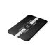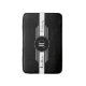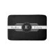 Monogrammed bathmat with initials framed in a black circle with white border and white stripes with first and last name flanking monogram.