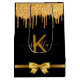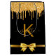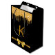 A favour bag for a girly and glamourous baby shower or bridal shower. Black background decorated with faux gold glitter drips, paint dripping look. Personalise and add your name and monogram letter. The name is written with a trendy hand lettered style script with swashes.