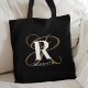 This modern stylish custom monogram tote bag features an elegant gold script initial monogram with a bold white initial and name superimposed, on a black background.