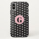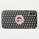 Dress up and protect your iPhone with a polka dots pattern with a round circle design element that is custom monogrammed. Black White and Pink colours. Easily personalise this case with your name/initial/monogram