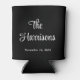 Black monogram wedding can cooler party favour with your married last name in a stylish white script on one side, and your first names inside a heart wreath on the other side.