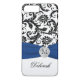 Monogrammed modern black and white floral damask pattern Case-Mate iPhone 7 Case with royal blue PRINTED ribbon and PRINTED faux engraved look crystal brooch. Customise it to add your name, initial, or other text. If you need assistance, email niteowlstudio@gmail.com.