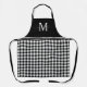 This monogram apron features a black and white gingham pattern with a solid black at the top where your initial and grey name can be added.