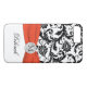 Monogrammed modern black and white floral damask pattern Case-Mate iPhone 7 Case with bright orange PRINTED ribbon and PRINTED faux engraved look crystal brooch. Customise it to add your name, initial, or other text. If you need assistance, email niteowlstudio@gmail.com.