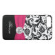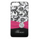 Monogrammed modern black and white floral damask pattern Case-Mate iPhone 7 Case with bright fuchsia pink PRINTED ribbon and PRINTED faux engraved look crystal brooch. Customise it to add your name, initial, or other text. If you need assistance, email niteowlstudio@gmail.com.