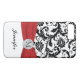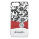 Monogrammed modern black and white floral damask pattern Case-Mate iPhone 7 Case with red PRINTED ribbon and PRINTED faux engraved look crystal brooch. Customise it to add your name, initial, or other text. If you need assistance, email niteowlstudio@gmail.com.
