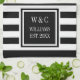 Elegant personalised initials monogram kitchen towel featuring a black and white striped pattern with your initials and family name with your established date set in a black-bordered square with a classic white text. Designed by Thisisnotme©