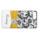 Monogrammed modern black and white floral damask pattern Case-Mate iPhone 7 Case with bright golden yellow PRINTED ribbon and PRINTED faux engraved look crystal brooch. Customise it to add your name, initial, or other text. If you need assistance, email niteowlstudio@gmail.com.