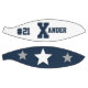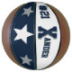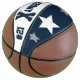 This is a full size basketball with two panels designed with a monogram name (large first letter) and uniform number, in popular college colours. This one is shown in blue, grey, and white. The second panel has team colours with three stars. All text, art, and colours can be removed, or changed as desired. One panel can be left white for autographs, etc.