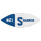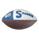 This is a full size football with one panel designed with a monogram name (large first letter) and uniform number, in popular college colours. This one is shown in blue and grey. The football is also available with two white panels so that a 2nd panel may include designs or room for signatures.