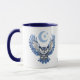 This unique and mystical mug design features a blue owl with outstretched, pattern image wings. His penetrating eyes look straight ahead and claws are outstretched. In the distance, behind and above him, is a crescent mood and silvery blue stars. The image is printed on two sides of the mug, and your name, monogram, or other text is between them. Everything stands out on a crisp white background.