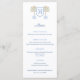 A menu design in light blue and dark blue (with orange accents provided by my own original watercolor illustrations of a stylised orange tree). The pattern on the reverse was created digitally by me. The monogram letter in the crest could be the first letter of the family name or the first name of the honoree (you could also access the design tool and delete this entirely to just leave the tree(s). You can also change the contrast colour on the reverse (currently a light green) by changing the background colour on the reverse side.