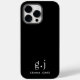 A black iphone case featuring a simple clean modern minimalist white monogram with simple lower case serif typography initials. A punctuation mark (period) divides the first and last initial as a simple design element that defines this typography style as modern and clean. Your name in uppercase serif type. Simple, clean and modern.