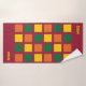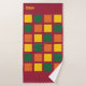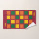 Stylish colourful Monogram Bath Towels with geometric squares in yellow, green and orange, against a burgundy background. There is a customisable monogram, which you can replace with your own initials or name. Modern addition to your bathroom decor. Matching items are available.