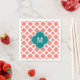 Monogrammed coral pink quatrefoil pattern with teal paper napkins. Pink quatrefoil patern on white. A teal quatrefoil shape in the middle.