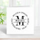 A stylish modern address stamp with a large initial in its centre partially covered by a family name with the first names and address arranged in a perfect circle around it. Please note, you may need to adjust the information you enter by adding or deleting some characters or spaces, to make the name and the address properly aligned.