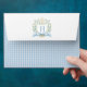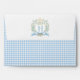 This envelope has a preppy grandmillennial design featuring a blue gingham pattern on the back flap with a crest your can personalise with your initial. The back and the inside have a coordinating floral pattern.