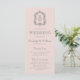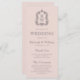 This elegant vintage-inspired wedding program features a pair of charcoal grey monogram initials in open serif font above and below a dividing line and encircled by a line art botanical crest on a blush pink background.