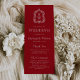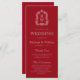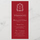 This elegant vintage-inspired wedding program features a pair of white monogram initials in open serif font above and below a dividing line and encircled by a line art botanical crest on a cranberry red background.