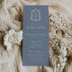 This elegant vintage-inspired wedding program features a pair of white monogram initials in open serif font above and below a dividing line and encircled by a line art botanical crest on a dusty blue background.