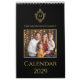 The front cover has a golden monogram initial in a faux gold crest in the upper part. In the center, it has a placeholder family photo in a faux gold frame. Under the crest and above the family photo there is the family name in golden caps. Under the photo, there is the word Calendar and under it the (editable) year, in bigger golden caps. The background is black.