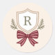 Elevate your holiday mailings with these stylish monogrammed envelope seals. Featuring a preppy, hand-drawn crest with evergreen sprigs and a rustic striped bow, this design adds a festive and personal finishing touch to your Christmas cards. Easily customise the seal with your monogram initial for a unique accent that is sure to impress your recipients. © Kimbellished, LLC