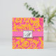 Damask Orange and Pink Wedding Invitations---match the RSVP cards and more found below on this page. Each invitation features a floral leaf damask print in a hot pink colouring over an orange background. The front and back also feature a pink printed band with a square monogram that you can customise to the groom's last name initial. Please note that Zazzle previews are compressed to prevent art theft; therefore, reds, oranges, and certain green shades may appear blurry. This is not a factor when Zazzle prints the products. Invitations will be blur free and of crisp, high quality. These wedding invitations are set to high quality basic card stock; however, you can change the stock to linen, felt (embossed), recycled, and several metallic shades if you would like under number 2 (choose your style, size & paper type) below the orange add to cart button. A list of the additional costs for a fancier card stock are displayed also under that option. Each invitation comes with a fitted white envelope.