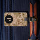 Luggage tag with a beige, tan, brown, and light green desert camo camouflage pattern and monogram initial(s) or name on a black circle monogram frame. Personalise with your monogram initial(s) or name, name, and address information using the easy templates. Font colour, font style, and font size are customisable.