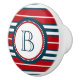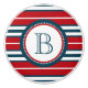 Nautical themed design with monogram decoration in round shape with rope illustration on blue, red and white striped background