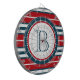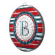 Nautical themed design with monogram decoration in round shape with rope illustration on blue, red and white striped background