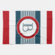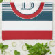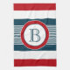 Nautical themed design with monogram decoration in round shape on blue, white and red striped background