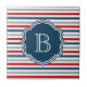 Nautical themed design with monogram decoration on blue, white, red and grey striped background