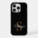 This personalized black iPhone case features elegant script typography and a gold monogram. It is easily customizable.