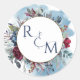 Beautiful wedding monogram envelope seal of favour sticker label with couples initials encased by gorgeous watercolor floral bouquet with flowers and foliage in dusty blue, navy, burgundy, purple and magenta hues with exquisite blue watercolor stain cascading behind. Part of our "Celestial Blooms"" collection with variety of coordinating products available.