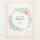 Modern watercolor artwork featuring eucalyptus twigs with rich foliage combined with peach pink peonies forming a beautiful floral wreath. Customisable name and year in a fancy border. Gentle pastel colours, peach, sage, light green, jade, cream, blush pink, light orange, coral. Blotchy watercolor drops on the background. Great personalised gift.