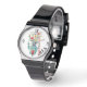 Stylish black silicone buckle strap round watch with primary numbers. The whimsical face design features a watercolor illustration of teal teapot fairytale house adorned with colourful wildflowers, a red wood door and ladder. Elegant black monogram initials can easily be changed or removed using the Template provided. This design will fit the clear and white silicone watches.